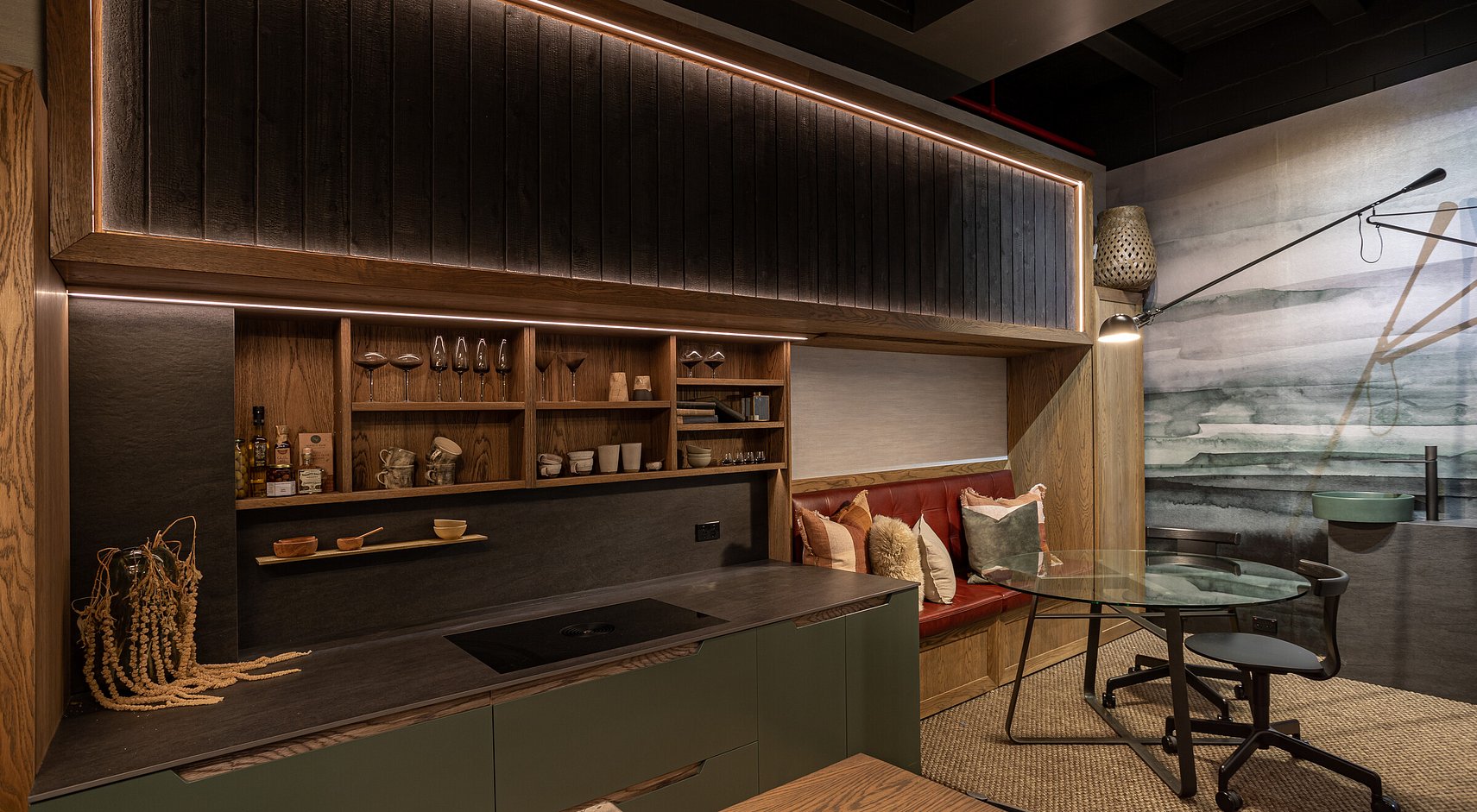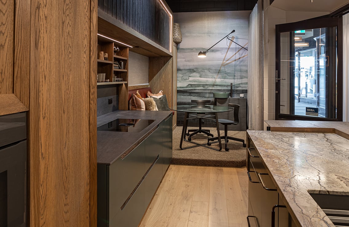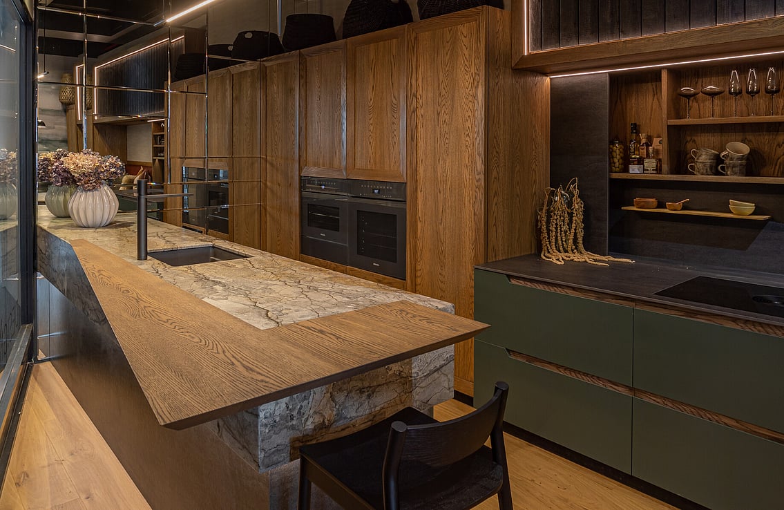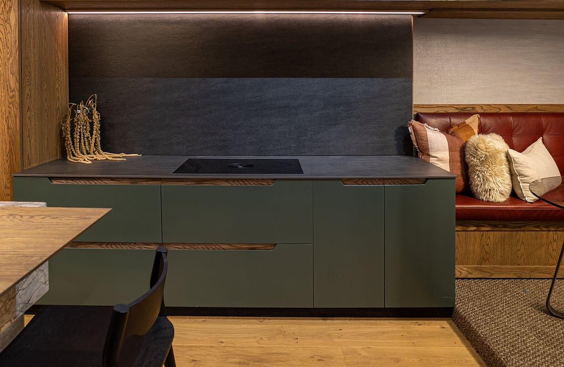 FEATURED MATERIAL - Island = Silver Roots Marble - Hob + Sliding Door = Dekton Sirius